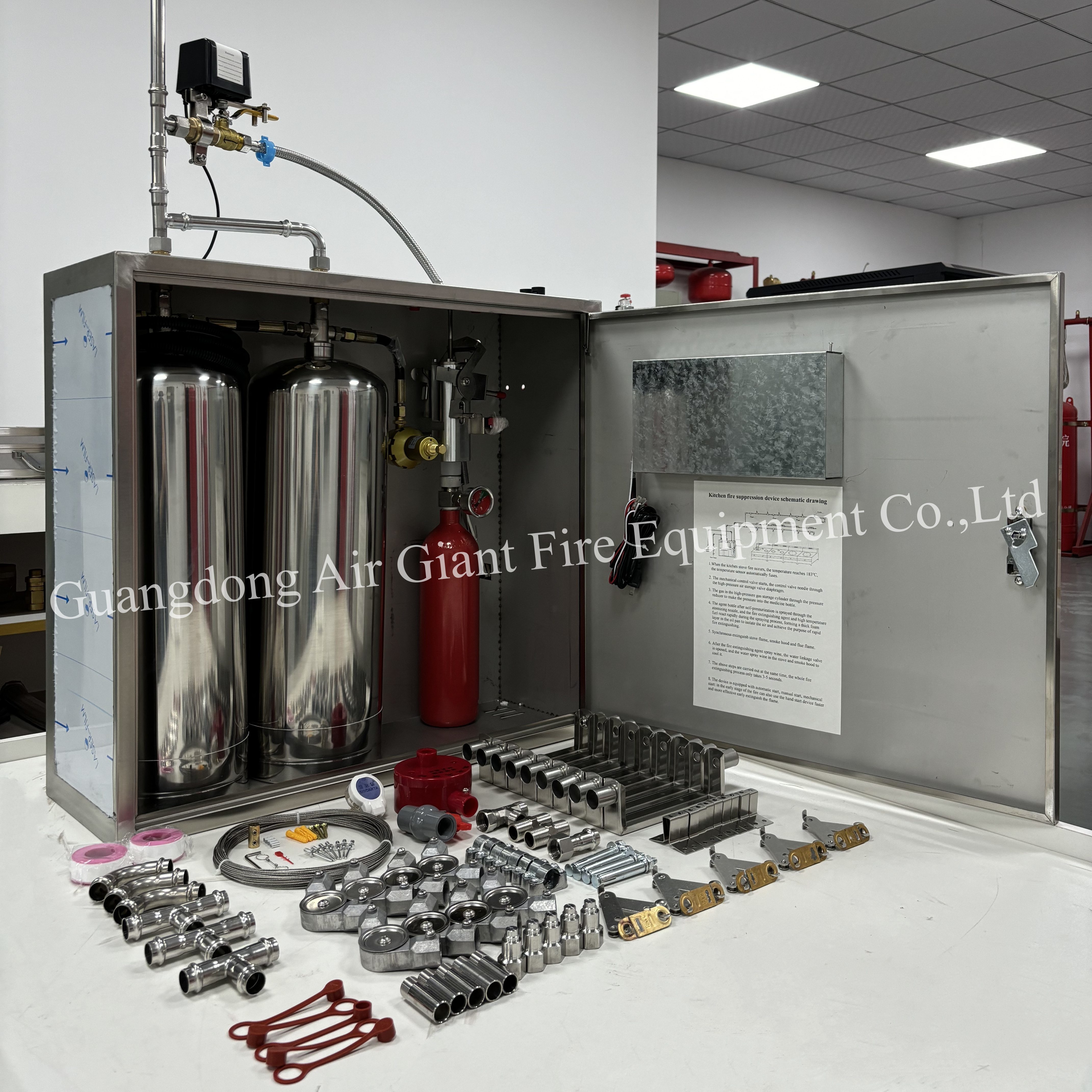 Mutfak ekipmanları yangın söndürme cihazı birendüstriyel mutfaklar, ticari mutfaklar ve sivil mutfaklar gibi yüksek nemli ve sıcaklık ortamlarında monte edilen cihazların tam seti, şunları içerir: