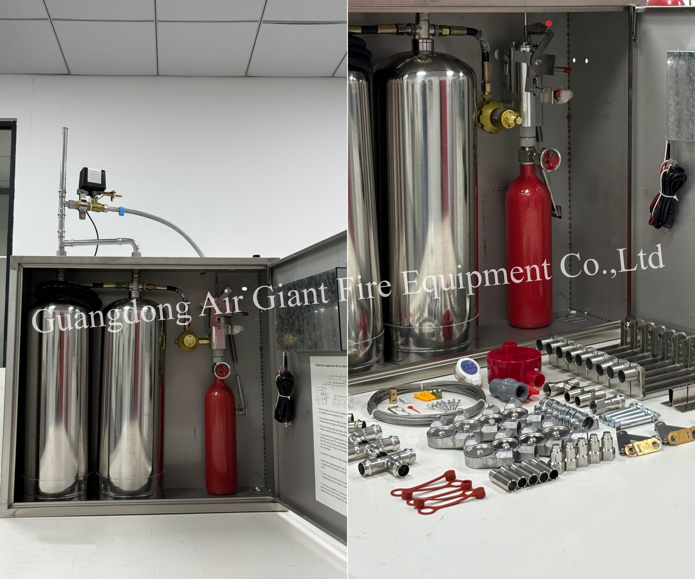 Mutfak ekipmanı yangın söndürme cihazı, endüstriyel mutfaklar, ticari mutfaklar ve sivil mutfaklar gibi yüksek nem ve ısı ortamlarına monte edilen, aşağıdakileri içeren eksiksiz bir cihaz setidir: